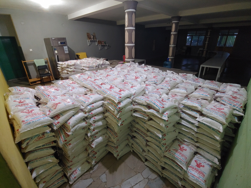 우리 텐포원은 긴급하게 옥수수 가루 6.5톤을 구입하여 수해민 한 가정에 5kg씩, 총 1300가정에 순차적으로 나눠드리고 있습니다.