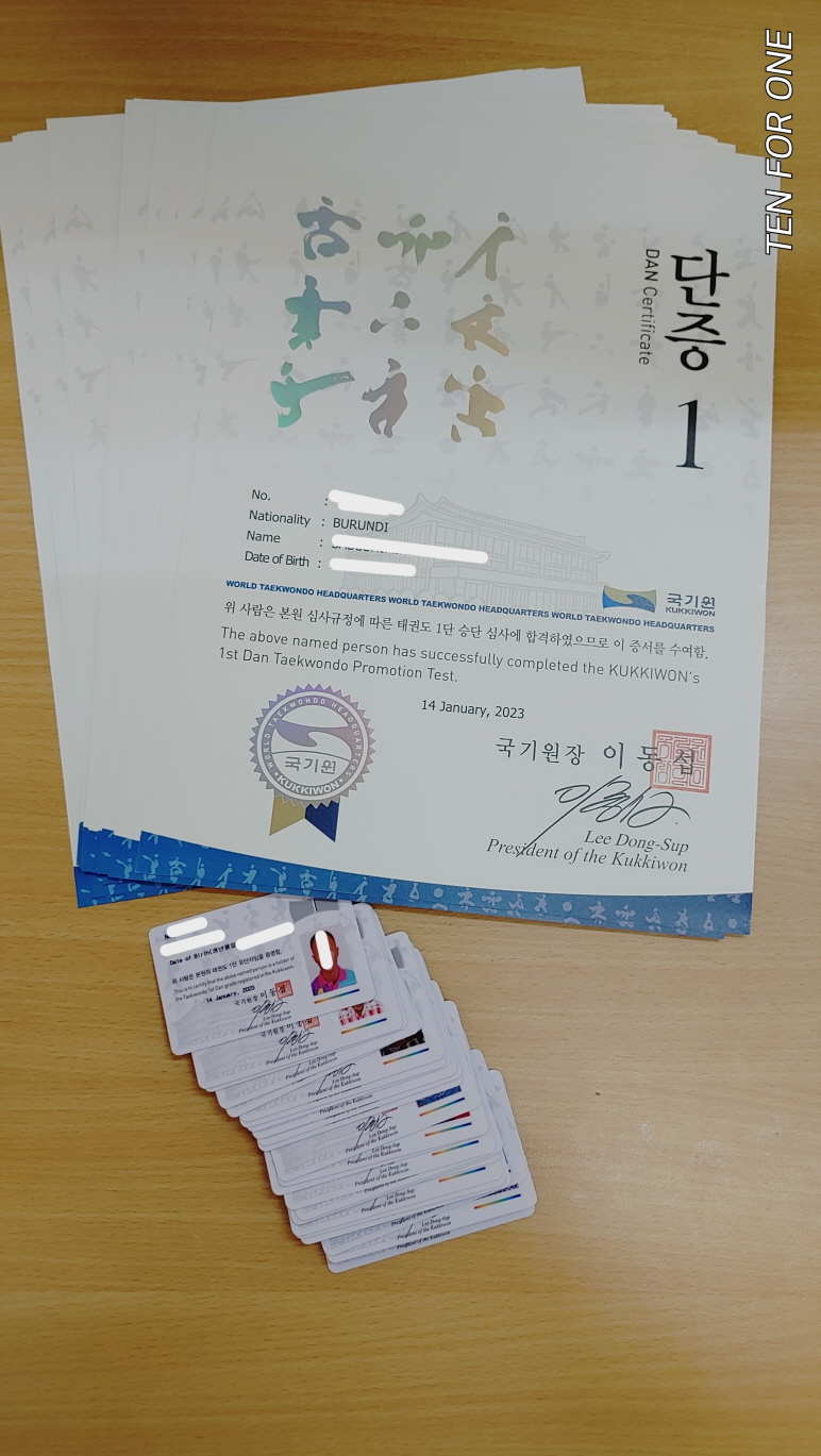 그리고 작년 12월에 했던 승단심사의 결실인 '국기원 단증'이 부룬디에 100일 만에 도착을 했습니다.