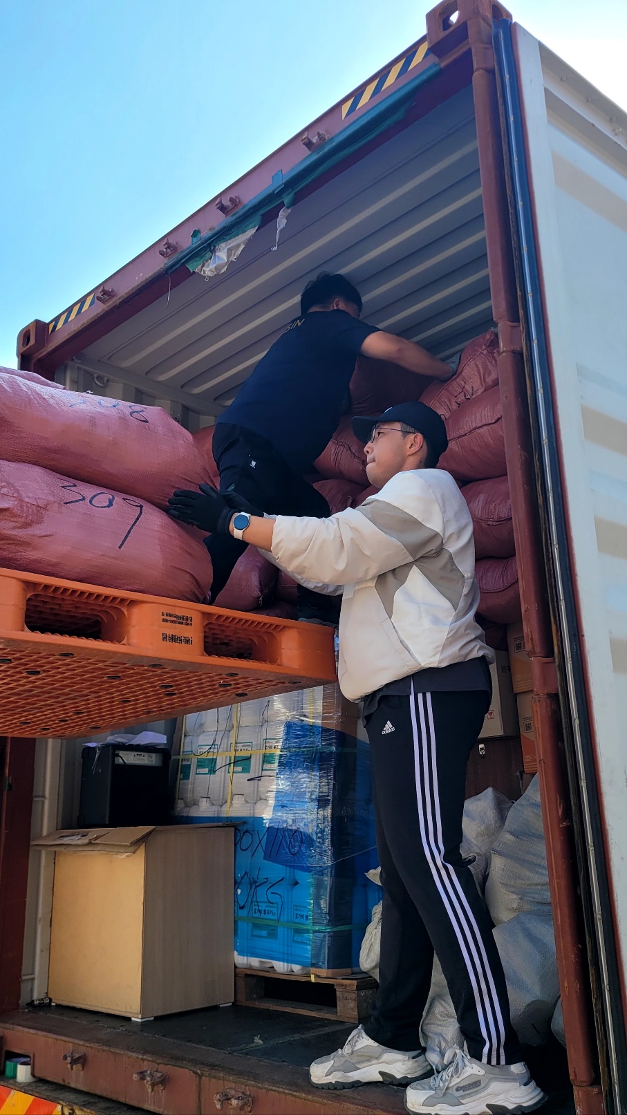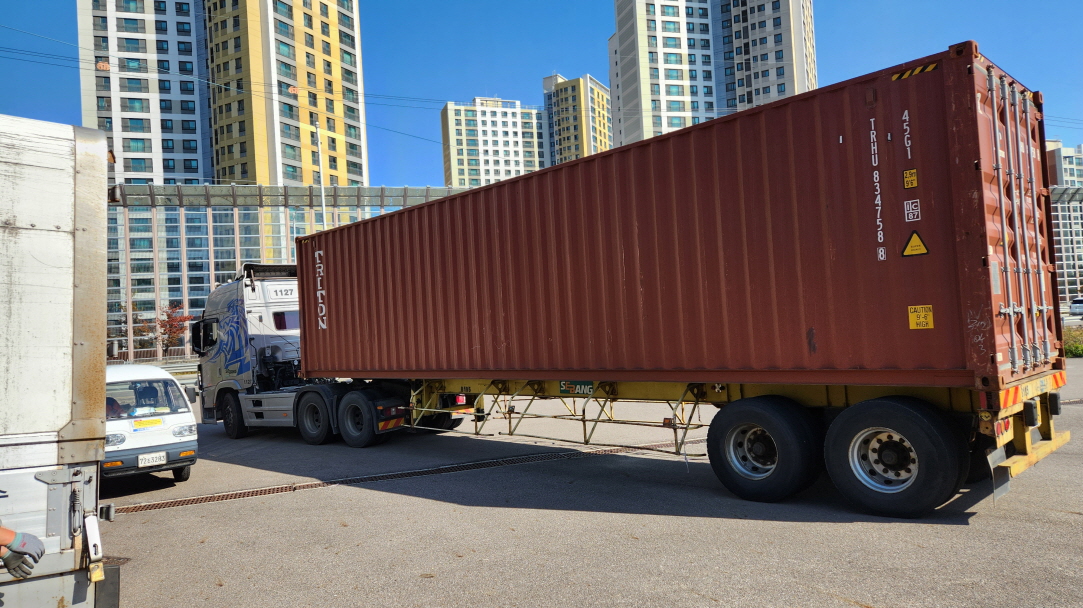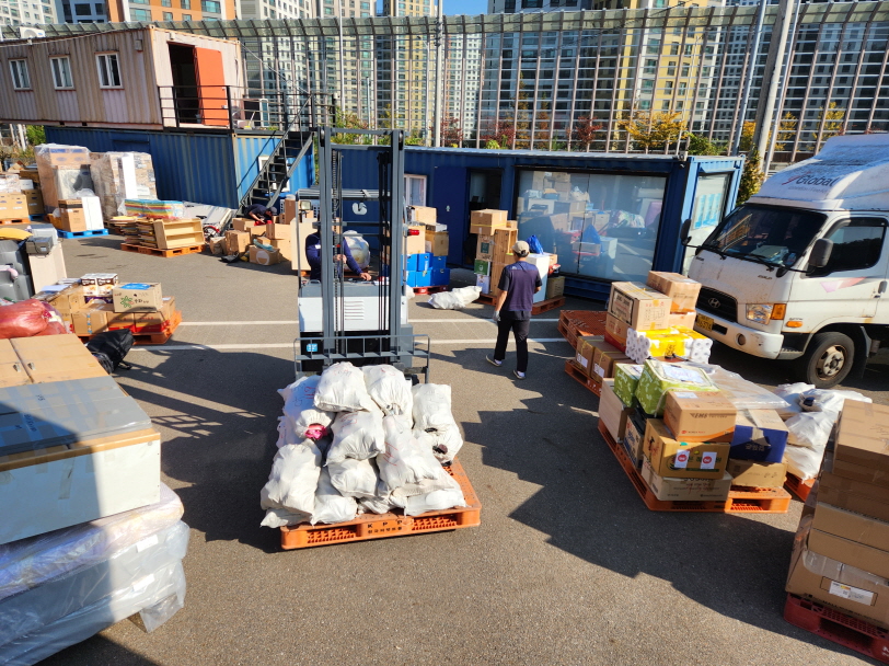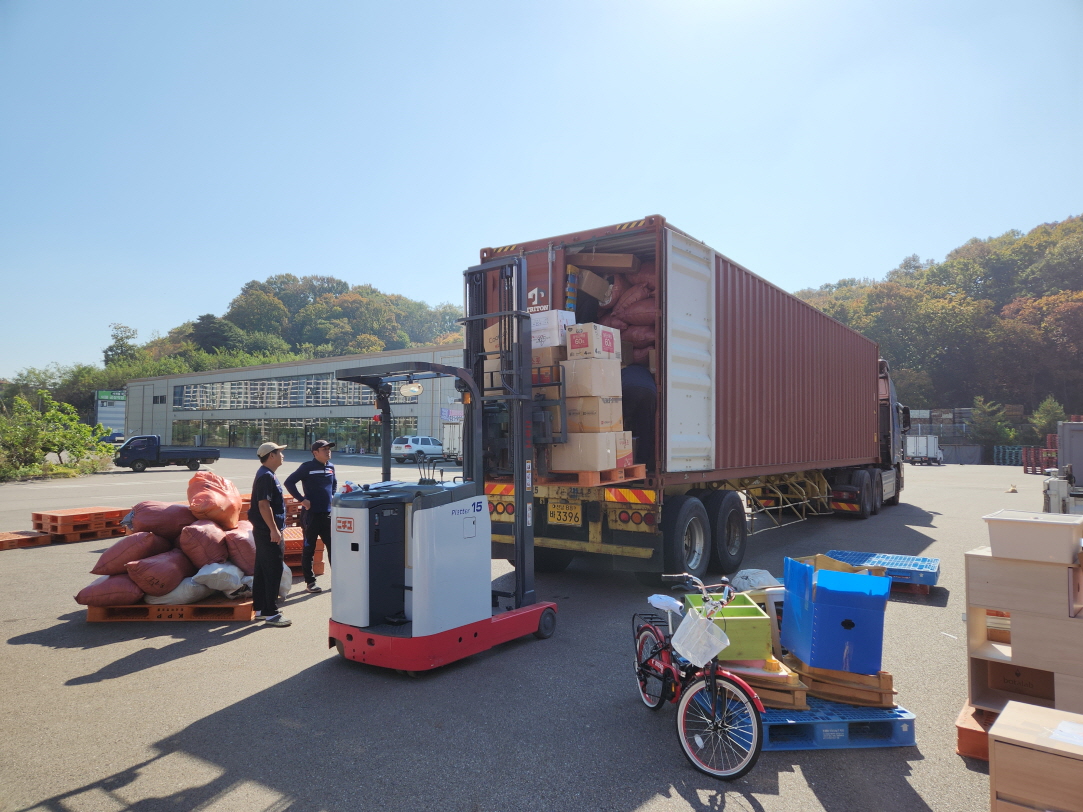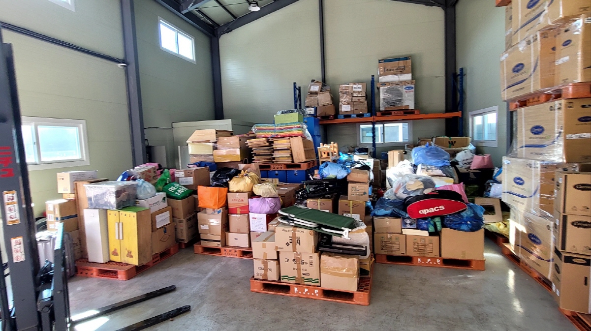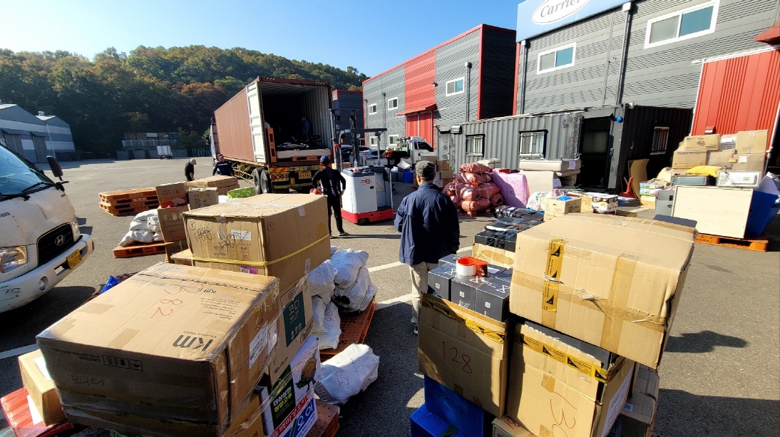 이번 컨테이너에 가온태권도장과 거인회에서 후원해 주신 태권도용품이 들어있는데,